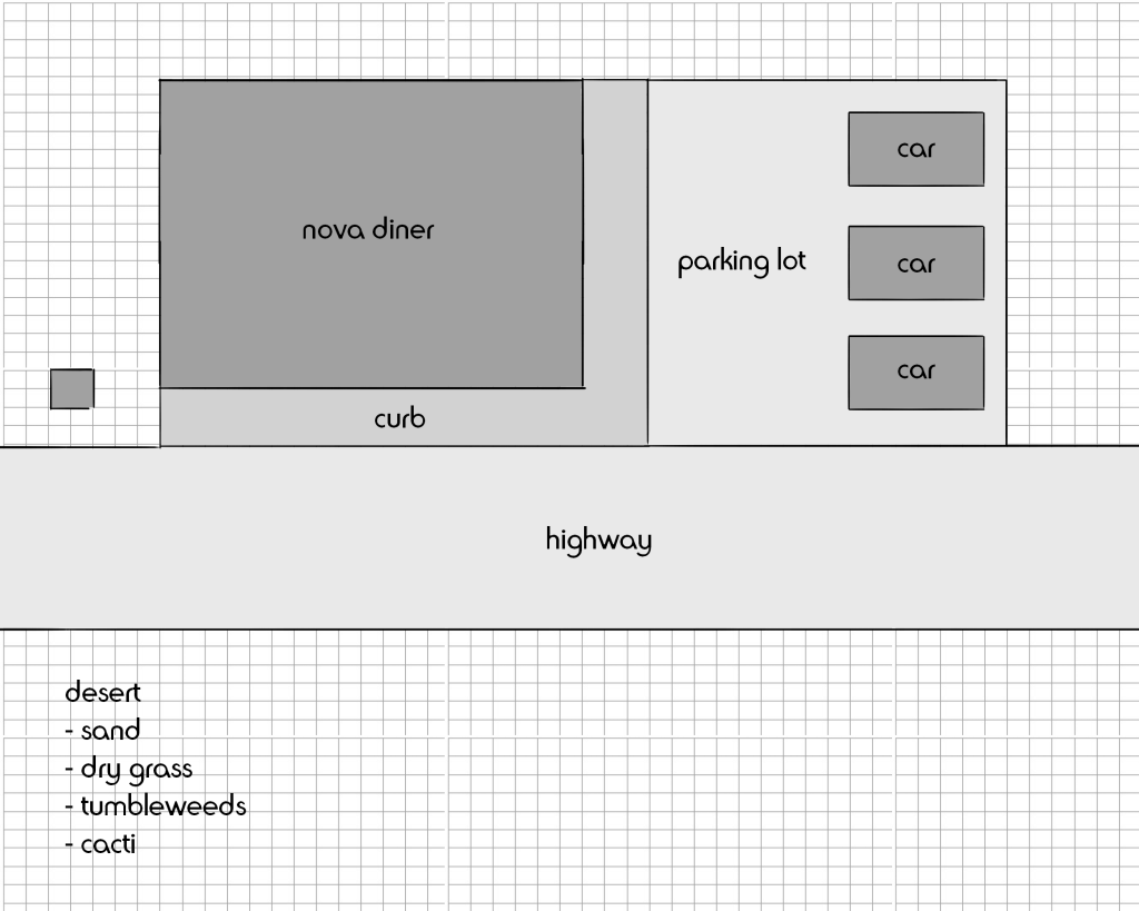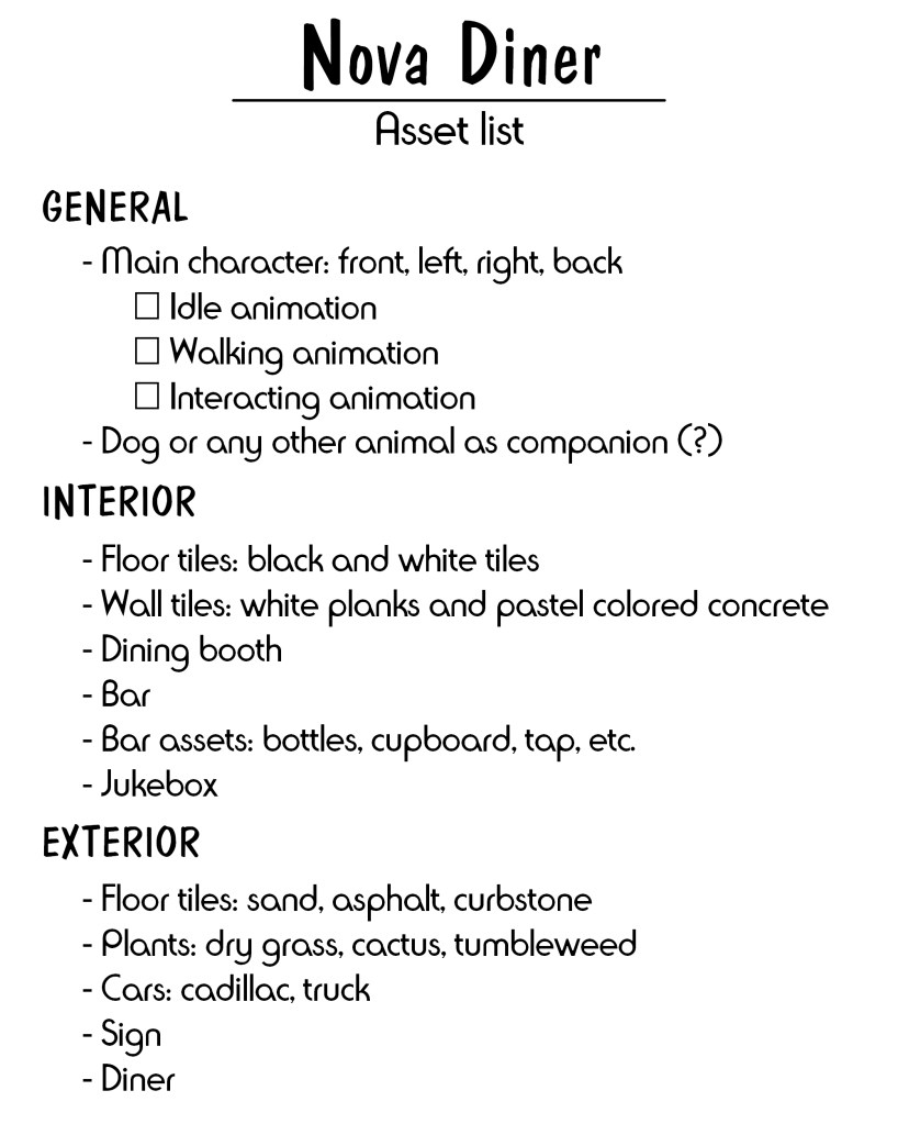 The most important assets in this environment would be: the main character, the diner (exterior view), a dining booth (diner interior), a bar, and a jukebox. Other important exterior assets include a sign (neon, maybe), a parking lot with maybe a truck or a car, and some desert plants (a cactus, a rolling tumbleweed). As I mentioned above, I’ll first be focusing on the interior of the diner, meaning I’ll probably start with the main character, diner booth, bar, and jukebox.