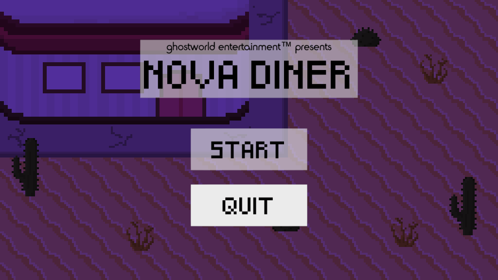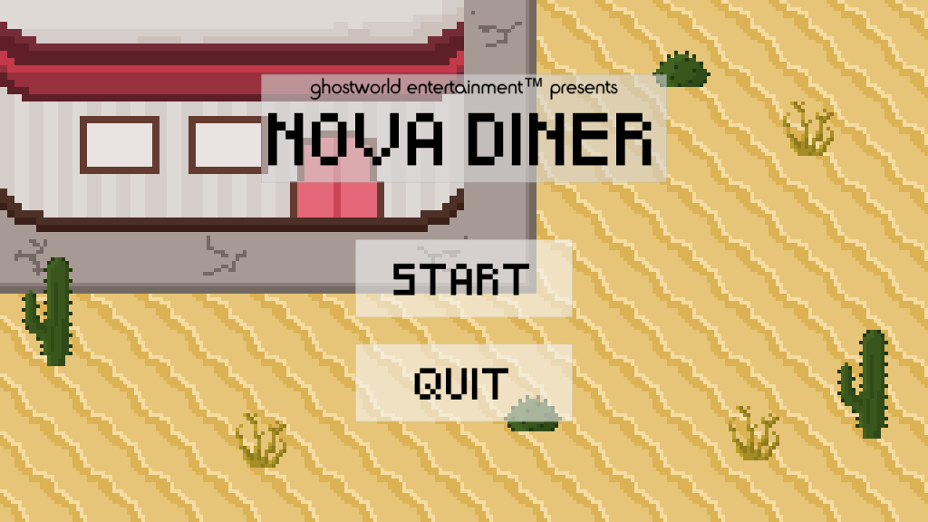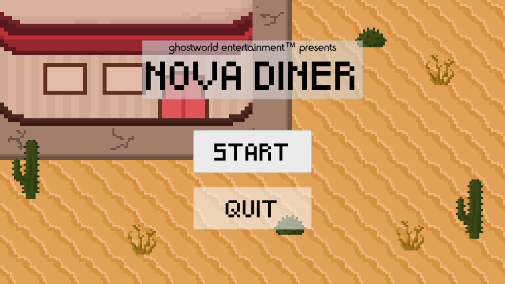 I decided to use the same perspective for the start screen as the game itself. This way, I was able to reuse some of the assets I already made. These are also the assets that might not make it into the game, because they’re part of the exterior and I might scrap the exterior, so now they’ve been useful anyway. I did have to create a part of the diner and some curb for this background. If I do decide to keep the exterior in, I can use these assets as well.